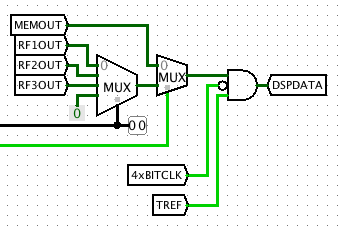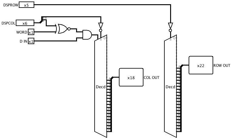 I also removed the flip-flop that was holding a value for the display data input line and replaced it with a gate that pulses the input during the second half of each refresh cycle. With the "Light Persistence" parameter of the LED matrices set to 3500 ticks (slightly longer than a complete display refresh) this produces a stable display.