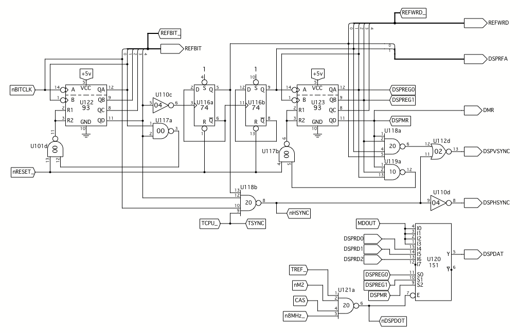 display/refresh bit address (REFBIT). U116 and U123 form a 6-bit