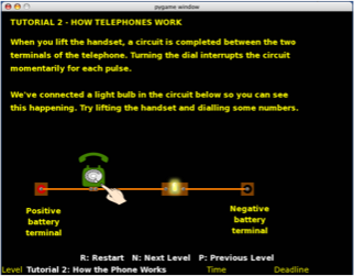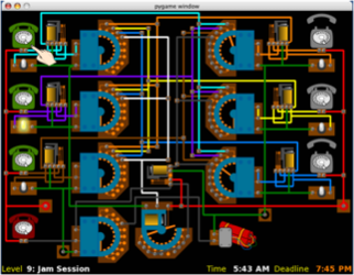 A Puzzle Game and Electromechanical SandboxThis is a game involving telephones, relays, rotary switches, and other electrical things that make nice whirring and clicking noises. As well as challenging yourself to solve the puzzles, you can also use the comprehensive built-in level editor to create new puzzles for yourself and others, or just to play around and have fun with the parts.This game was developed from my PyWeek 5 game programming competition entry. Since the final competition submission, I have tidied it up, added more levels, added a game saving ability, and considerably improved the level editor. DownloadMacOSX5B-0.6.1-MacOSX.dmg