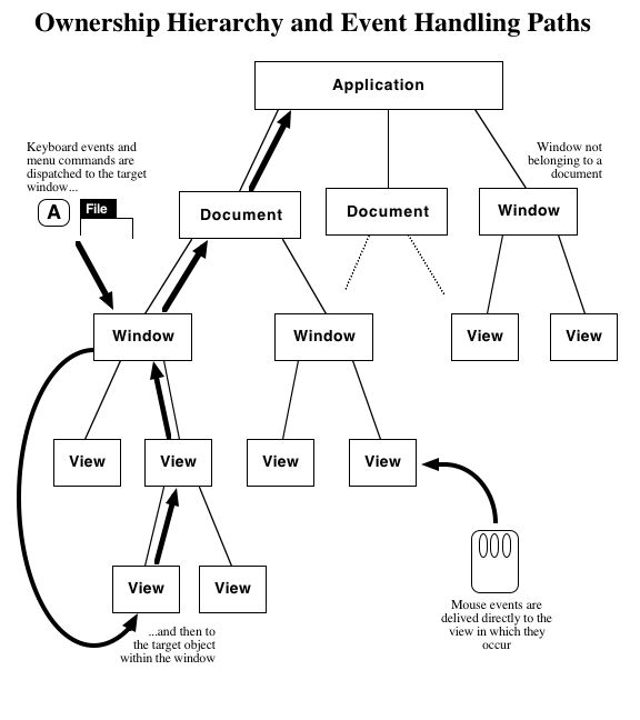 The ownership hierarchy serves two purposes. It defines a path for handling events (see Event Handling), and it allows a Document to be closed when all the Windows belonging to it have been closed.