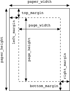 are the paper size (the physical size of the sheet of paper) and the margins (the distances from the edge of the paper to the region that will be printed on). Together these determine the page size (the size of the printed area). The following diagram illustrates the relationships between these attributes.